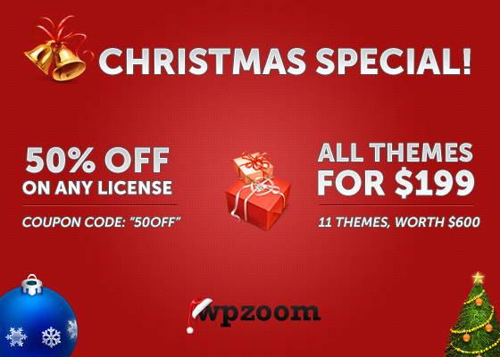 Save big with latest valid WPZOOM Discount Code.WPZOOM give out big discount on all wpzoom premium wordpress themes, this is a Christmas Special:50% OFF & All Themes Pack for $199!(including 11 Themes, worth more than $600).